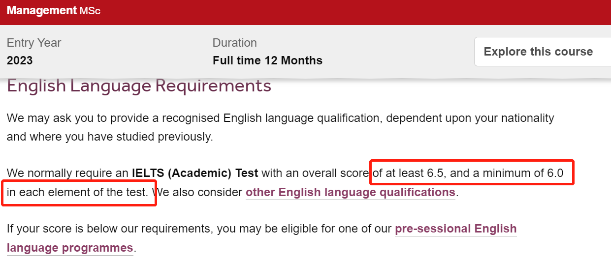 英国兰卡斯特大学针对2023年10月入学的管理学院授课型硕士专业,语言要求由原来的雅思总分7.0(单项不低于6.0)下调为雅思总分6.5(单项不低于6.0)。其它的语言成绩也相应做了调整,将总分要求下调。