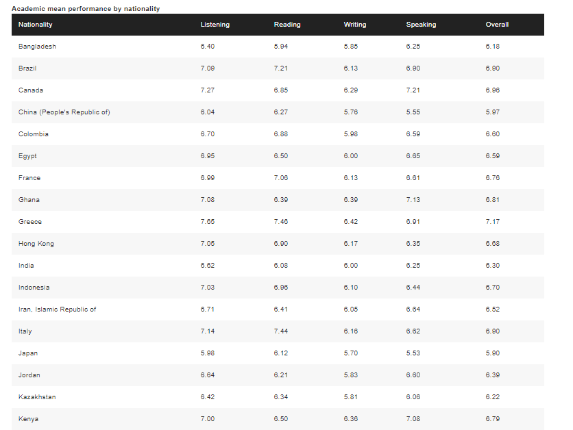 这里截取了一部分按国籍划分的雅思平均成绩