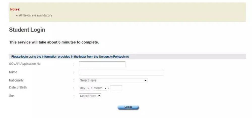 3、输入学校给你的“SOLAR Application No.”,登录。