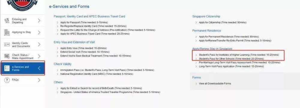 1、登录ICA官网https://www.ica.gov.sg/,点击左侧“e-Services and Forms”栏目,选择Student‘s Pass。
