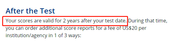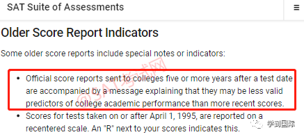 但在CollegeBoard官网上有一段话:如果考生离开高中一年并且一年内没有考试的话,成绩会被存档。考试时间在五年或者更长时间发送给大学的官方报告会附加一条消息,解释与最近成绩相比,它们可能不太有效地预测大学学业成绩。(ETS在解释为什么托福成绩有效期是两年的时候,也是用了这句话)