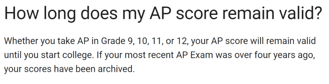 AP成绩的有效期,CB的官方答复是“until you start college(直到你开始上大学)”。不过,CB也同时说明,四年前的AP成绩通常会被archived(存档)。因此,我们还是建议大家使用四年之内的AP成绩。