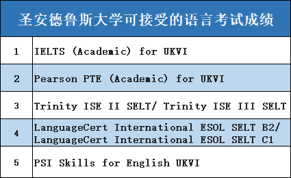 圣安德鲁斯大学2023年9月至2024年8月开始的课程是不接受在线语言成绩的,以下是可接受的线下语言成绩考试: